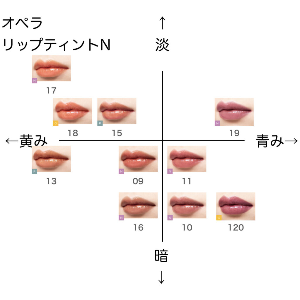 リップティントN【オペラ】ほぼ全色比較|ブルベ・イエベ向きの色味をチャートで解説